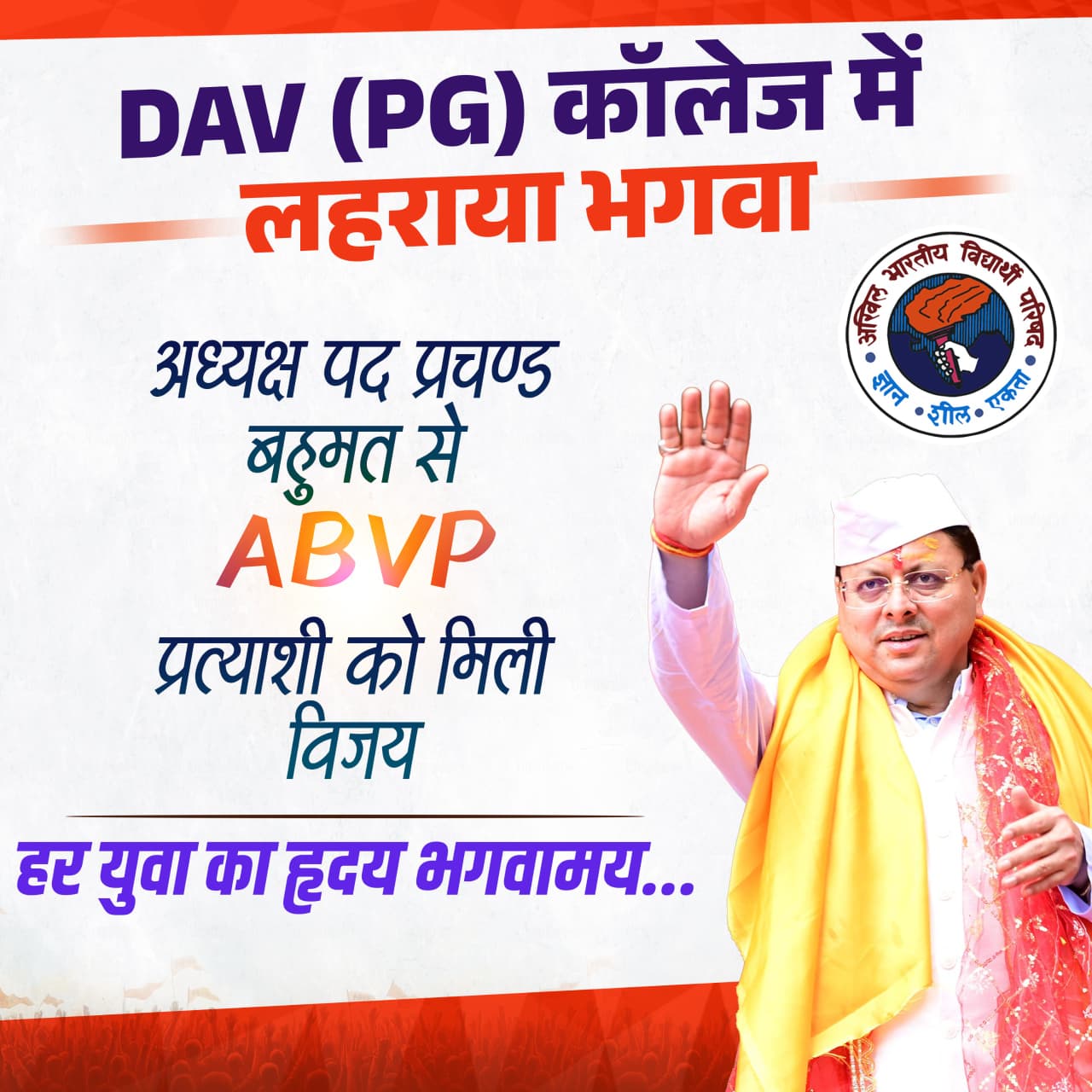 अखिल भारतीय विद्यार्थी परिषद (ABVP) को मिली बड़ी और ऐतिहासिक जीत ने स्पष्ट कर दिया कि प्रदेश के कॉलेज और विश्वविद्यालयों के छात्र, खासकर GenZ, भाजपा की विचारधारा और मुख्यमंत्री पुष्कर सिंह धामी के नेतृत्व वाली सरकार की नीतियों पर भरोसा रखते हैं। चुनाव परिणाम यह भी बताते हैं कि छात्रों के बीच सरकार के प्रति विश्वास की स्थिति विपक्ष के आरोपों से कहीं अलग है।