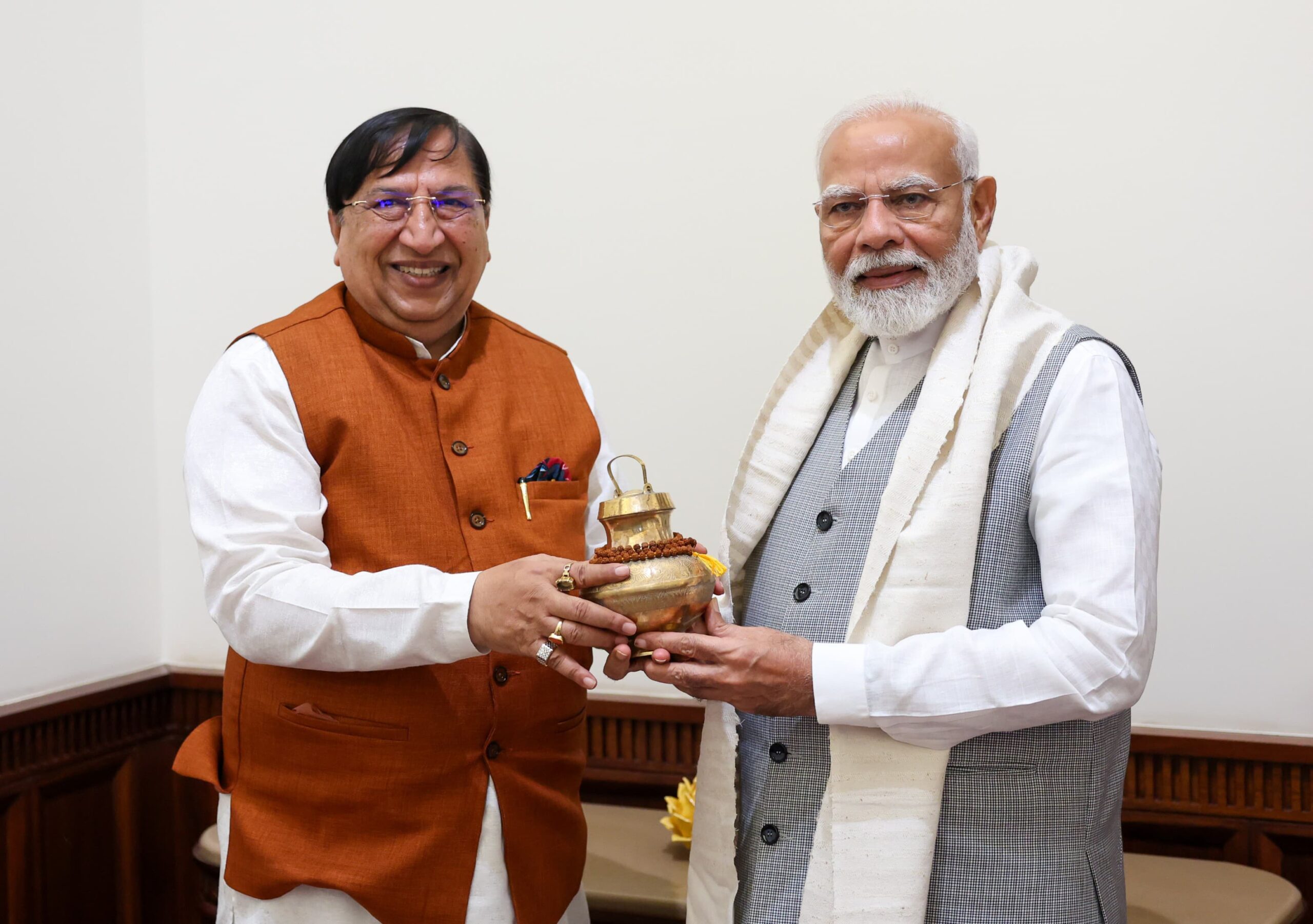 इस मौके पर डा. नरेश बंसल ने आदरणीय प्रधानमंत्री जी को आज हथकरघा दिवस पर उत्तराखंड के कारीगरो द्वारा निर्मित “हिमाद्री” का बना शाल व सावन के पवित्र माह मे मां गंगा के जल से भरी गंगाजली एवं भगवान शिव की प्रिय रुद्राक्ष की माला भेंट की ।