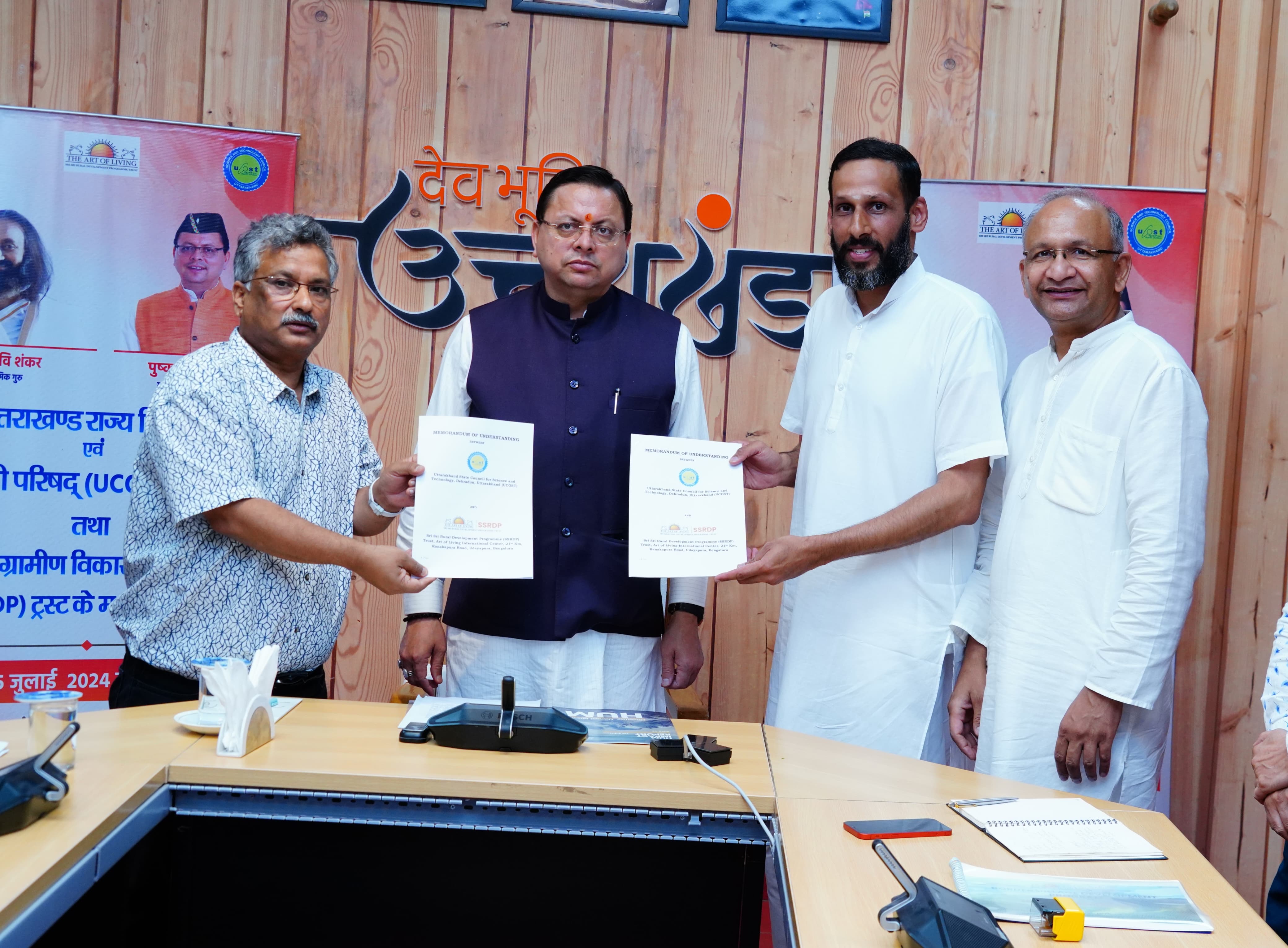 प्रदेश के ग्रामीण स्कूलों में 04 किलोवॉट के सोलर पैनल एवं मॉर्डन क्लास रूमों का निर्माण श्री श्री ग्रामीण विकास परिजनों ट्रस्ट (SSRDP) द्वारा किया जाएगा। इस संबंध मंे शुक्रवार को सांय मुख्यमंत्री आवास में मुख्यमंत्री श्री पुष्कर सिंह धामी की उपस्थिति में युकॉस्ट के महानिदेशक प्रो. दुर्गेश पंत तथा ऑर्ट ऑफ लिविंग एवं SSRDP के प्रतिनिधि श्री दीपक शर्मा के मध्य एमओयू हस्ताक्षरित किया गया।